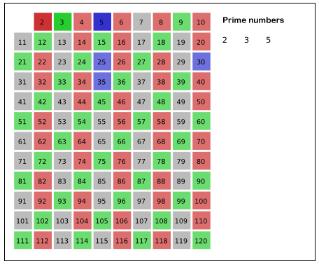 이 방법을 이용해서 A부터 K까지 반복문을 돌리고 남는 수는 모두 소수 리스트에 추가하면 빠르게 범위 내의 수 중에서 소수 리스트를 구할 수 있다. 위 예시에서는 1부터 120까지의 수 중에서 최대 범위 수는 11이므로 1부터 11까지 반복문을 돌려서 소수인지 판별한 뒤, 위 로직과 같이 처리하면 된다. 이때 1부터 11까지 반복문을 돌릴 때 3 소수인지 판별하고 배수를 모두 소수가 아닌 수로 처리하면 된다.