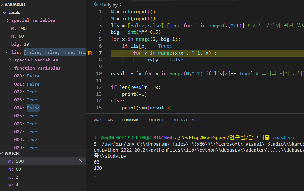 아래 코드 풀이에서 가장 핵심이 되는 부분은 이중 반복문에서 for y in range(x+x, M+1, x)인데 이 부분이 정말 예술인 것 같다. 이 코드의 뜻은 루트 M만큼 반복하면서 그 처음 그 수는 건너뛰고 그다음 배수(x+x)부터 x 간격으로 모두 False로 설정하는 코드인데 처음 이 코드를 봤을 때는 이렇게 코드를 짜면 1-10 이내에 범위들은 소수 그냥 건너뛰니까 소수가 다 안 구해지지 않을까 라는 생각을 했는데 디버깅을 해보니 아니었다!