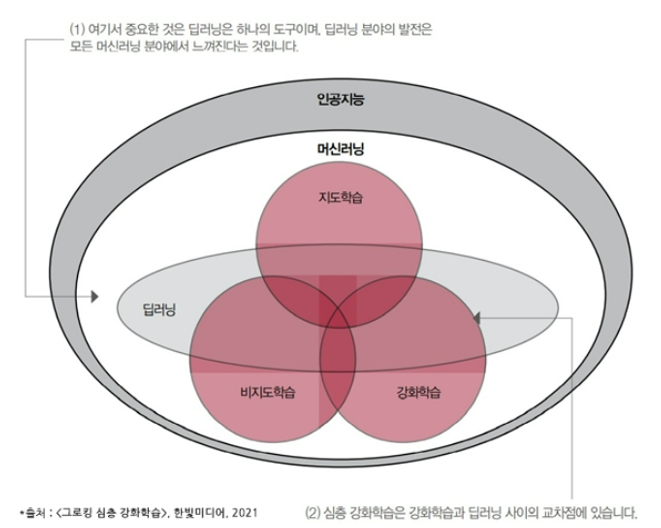 강화학습이란 AI의 분류 중 머신러닝(기계 학습)에 속하는 방법으로, 강화학습의 강화(Reinforment)는 시행착오를 통해 학습하는 방법입니다. 이는 행동심리학에서 영향을 받아서, 어떤 환경 안에서 정의된 에이전트가 현재의 상태를 인식해서 선택 가능한 행동들 중 누적 보상을 최대화하는 방향으로 학습하는 방법입니다. 아래 그림과 같이 머신러닝 안의 한 카테고리가 강화학습입니다.