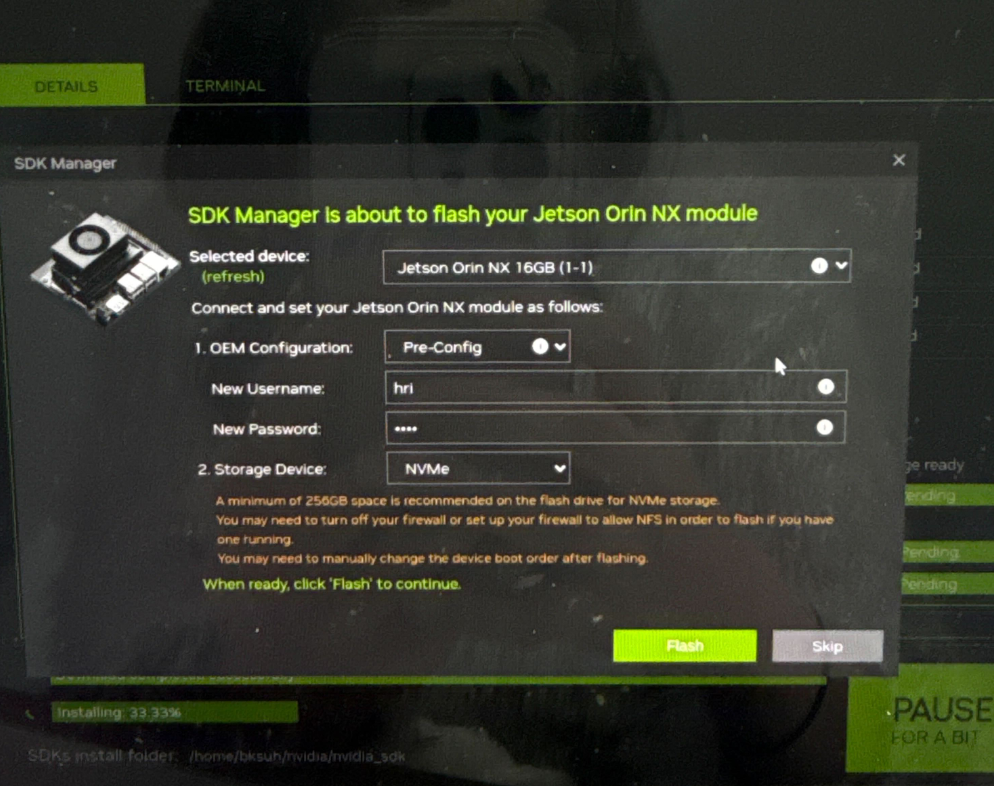 - host pc에서 nvidia sdk manager에 들어가 연결한 jetson과 다운그레이드할 버전을 선택하고 step2로 넘어갑니다