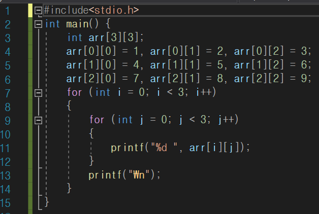 예를 들어 3행 3열짜리 int형 배열에 값을 할당하고 이를 출력할 수 있다.