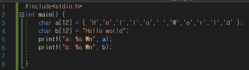 예를 들어 아래와 같이 중괄호로 Hello world를 선언한 배열 a와