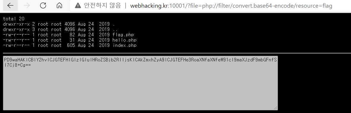 여기선 php://filter/convert.base64-encode/resource=flag이다.