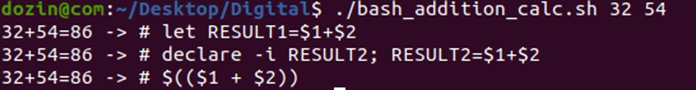 위 코드는 문자열 연산의 예제로 4line 에서 RESULT2를 정수로 declare해 주고 첫 번째 인자와 두 번째 인자를 뜻하는 $1,$2 를