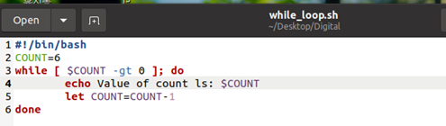 위 while문에서는 조건식을 –gt를 사용하여 COUNT가 0보다