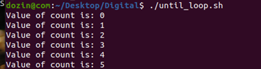 1씩 증가시킨다. 그런데 until 문은 조건이 거짓일 때 동작하므로 COUNT가 5보다 클 때까지라는 조건이 틀릴 때 즉 COUNT가 5일 때까지 동작하다가 COUNT=5를 출력하고 COUNT가 6이 되었을 때는 조건문이 참이 되므로 루프를 탈출한다.