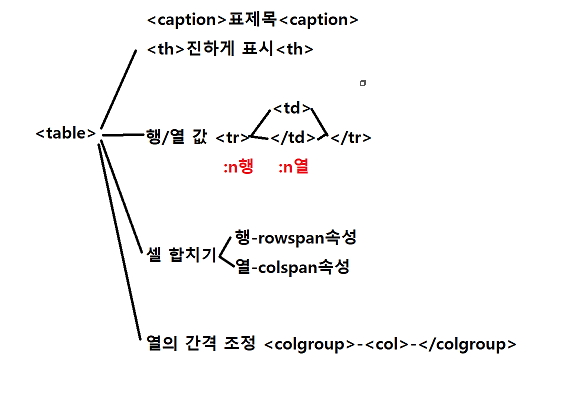 그리고 셀 합치는 rowspan과 colspan은 태그가 아닌 td/th에 들어가는 속성이다.