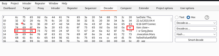 디코더로 가면 아래처럼 직렬화된 데이터임을 알려주는 패턴 ac ed 00 05를 확인할 수 있다.