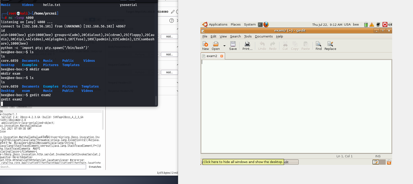 마지막으로 gedit을 실행해보면 bee-box에서는 아무것도 건들지 않았는데아래 오른쪽 화면처럼 gedit이 실행된다.