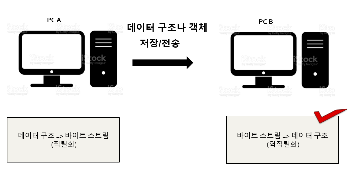 - 객체를 직렬화하여 전송 가능한(바이트 스트림) 형태로 만드는 것