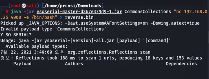새로 연 터미널에서 아래와 같은 명령어로 다운로드한 ysoserial파일을 페이로드로 만들고