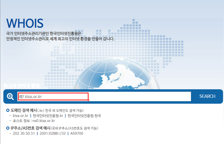 웹페이지에서는 KISA 후이즈 웹페이지에서 도메인을 통해 조회할 수 있다.
