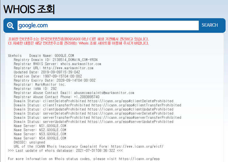 예를 들어 구글을 치면 아래와 같이 정보를 구할 수 있다.
