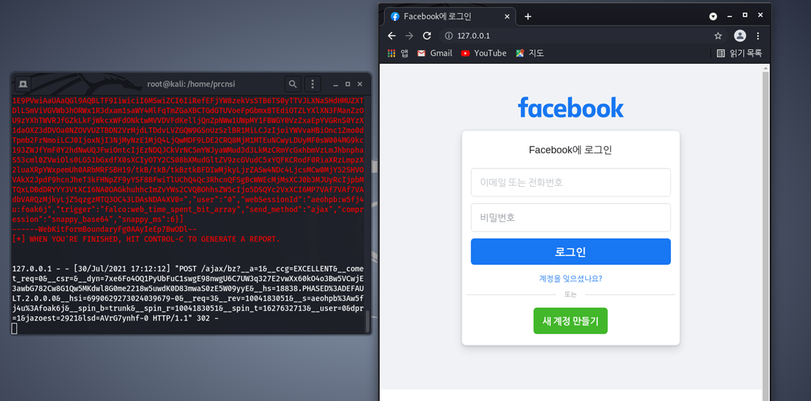 왼쪽은 터미널에서의 변화이고 로그인 버튼을 누르는 순간 진짜 facebook페이지로 리디렉트 됩니다.