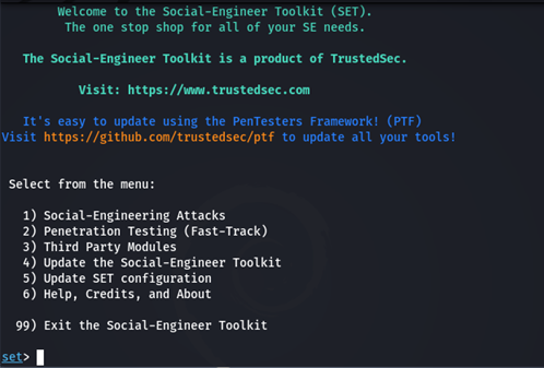 이어서 터미널에 setoolkitsetoolkit을 입력하여 들어간다.