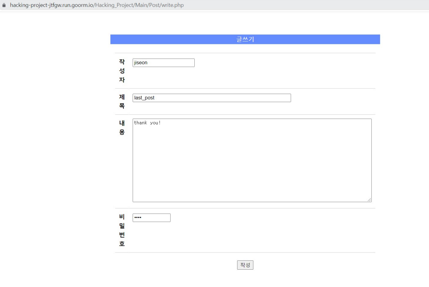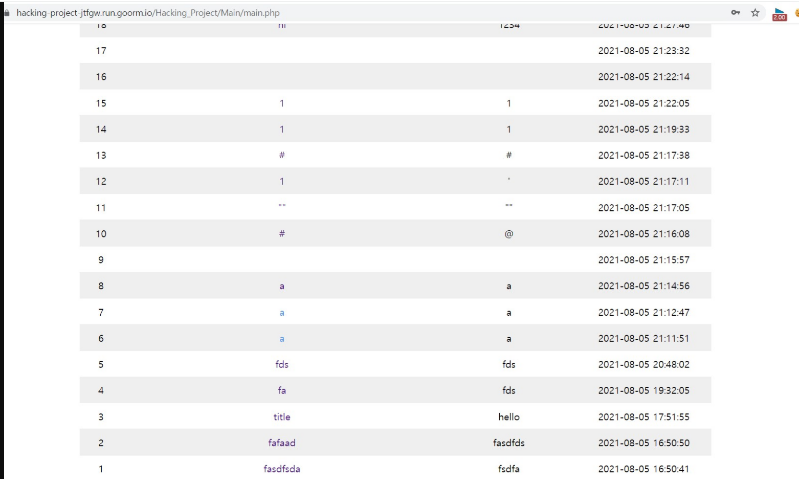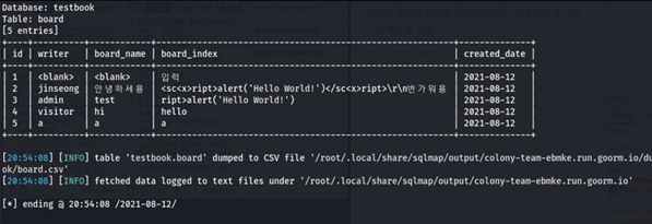 게시판에 작성된 글이 DB에 저장된 화면을 확인할 수 있다. 이상으로 3조 Writeup도 마무리된다.