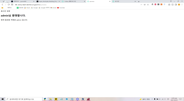 위 사진과 같이 현재 로그인 화면의 DB는 colony임을 알아냈다.