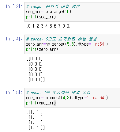 | 0으로 초기화된 배열 생성 | np.zeros((행,열),dtype='지정할 자료형') |