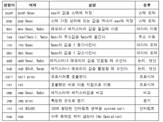 어셈블리어에는 Intel 문법(Window)과 AT&T 문법(Linux)이 있는데 Intel 문법이 주로 사용됩니다. 차이점은 Intel은 명칭 그대로 AT&T는 숫자 혹은 문자 앞에 $혹은 %를 사용한다는 점이 다릅니다.