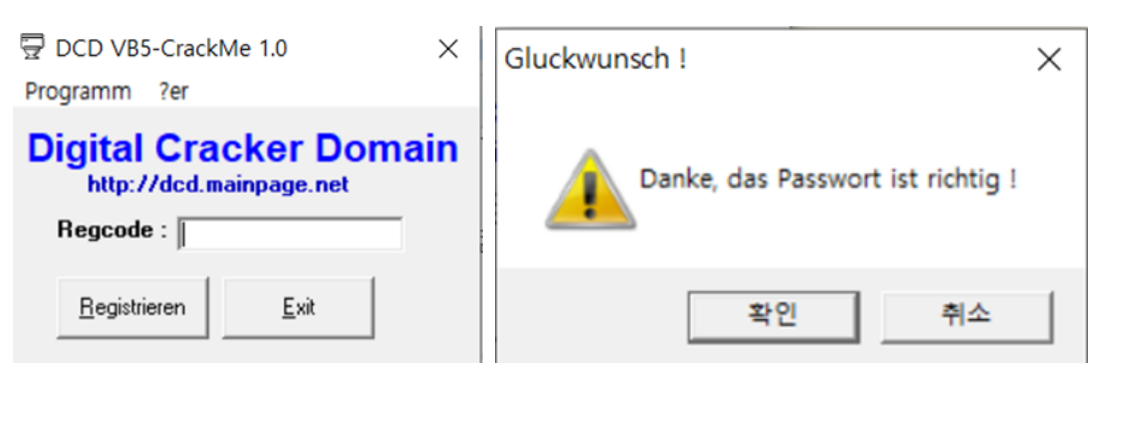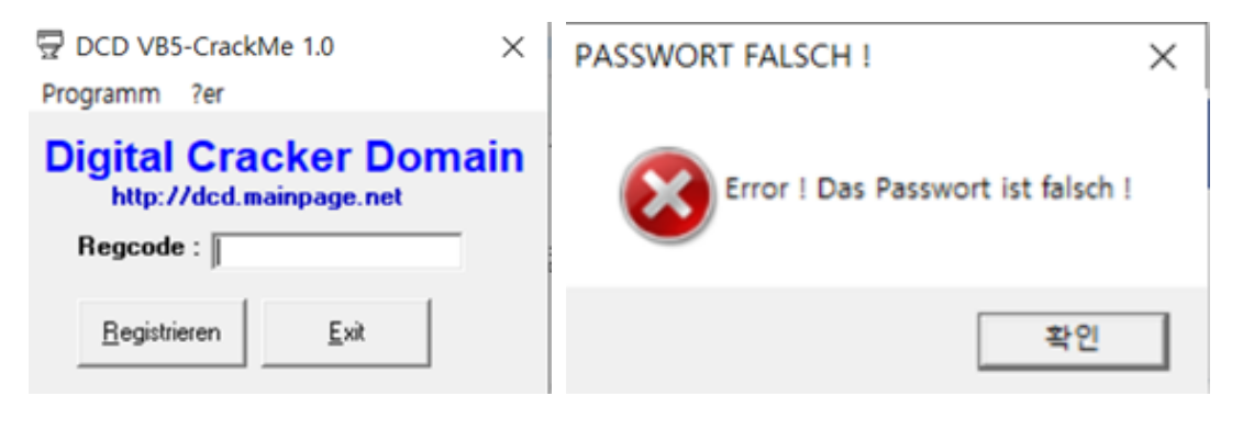 확인을 누르면 아래 좌측과 같은 Regcode를 치는 창이 나온다. 여기 아무 문자나 입력해 보면 패스워드가 틀리다는 error 메세지가 뜬다. 비밀번호가 맞지 않다는 걸 보니 맞는 비밀번호가 프로그램 코드 안에 있고 이를 비교하는 함수가 있을 것이다.