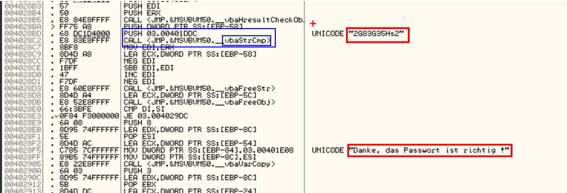 그리고 왼쪽에 어셈블리어를 보면 push로 입력받은 문자열을 vbaStrCmp라는 함수에 인자로 넣는 것을 볼 수 있다.