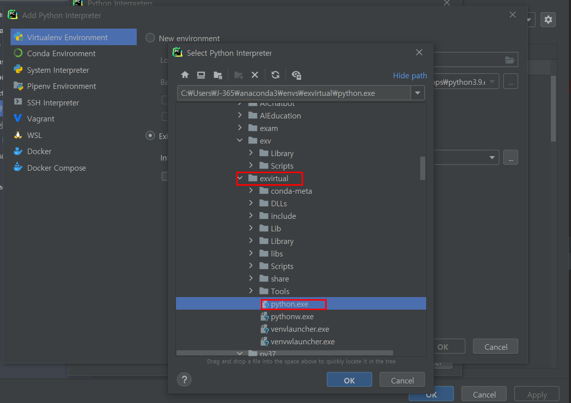 그리고 아까 생성한 가상환경(exvirtual)의 파이썬을 클릭해주고 ok를 계속 눌러주면 됩니다.