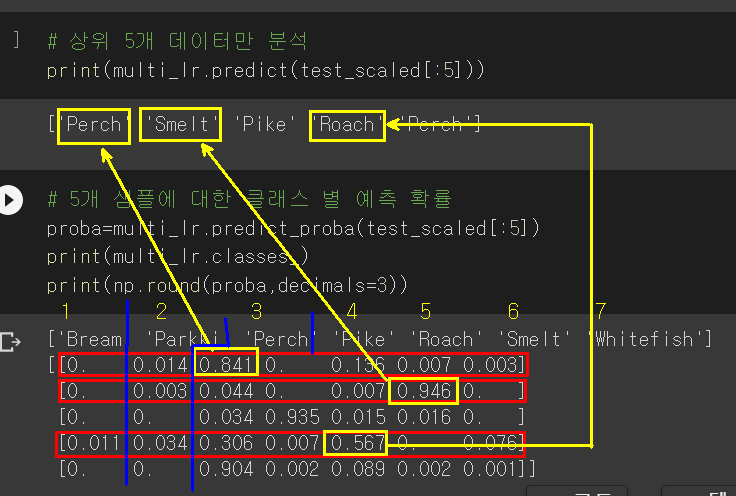 위 출력 결과에 대한 해석은 위와 동일하게 첫 번째 칼럼부터 7번째 칼럼은 각각 Bream, Parkki ~ 의 클래스에 차례로 대응되고 그에 대한 그 클래스에 대한 확률을 나타냅니다.