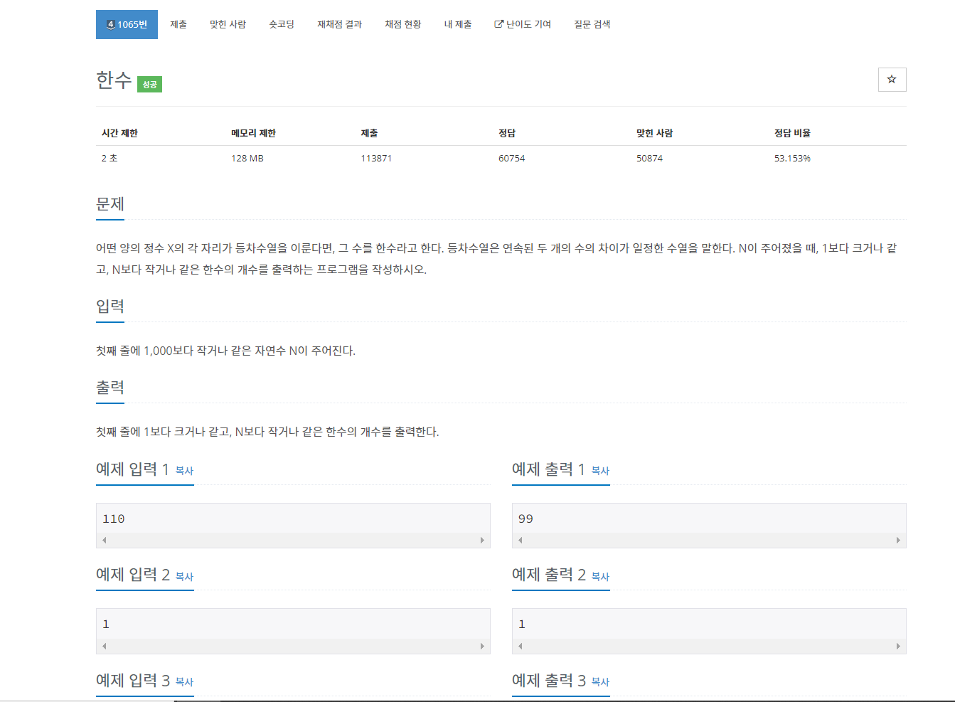 문제는 입력받은 수보다 작은 한수를 출력하는 것이다. 한 수는 각각의 자릿수가 등차수열을 이루는 수로 3번째 자리부터 이에 해당한다. 왜냐하면 최소 세 개의 자리가 있어야 차가 동일(등차)한 지 확인할 수 있기 때문이다.