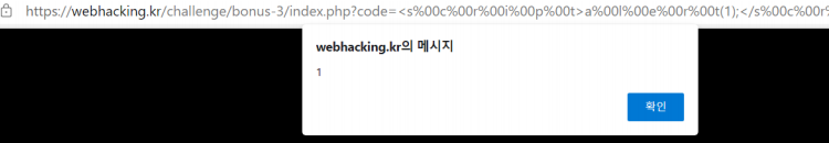따라서 NULL을 인코딩한 %00을 이용하여 단어 사이사이마다 끼워주면 아래와 같다. <%00s%00c%00r%00i%00p%00t%00>%00a%00l%00e%00r%00t%00(1);<%00/%00s %00 c%00r%00i%00p%00t%00> 이를 url에 code변수에 입력하면 풀린다.